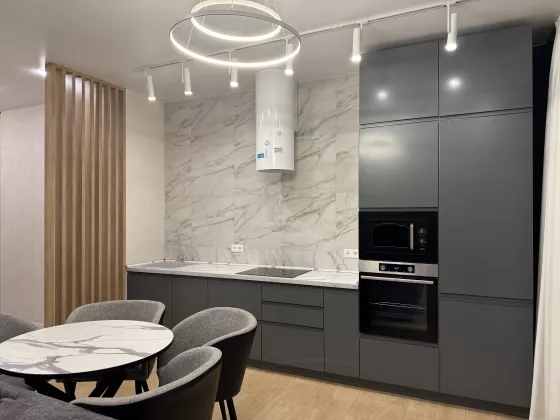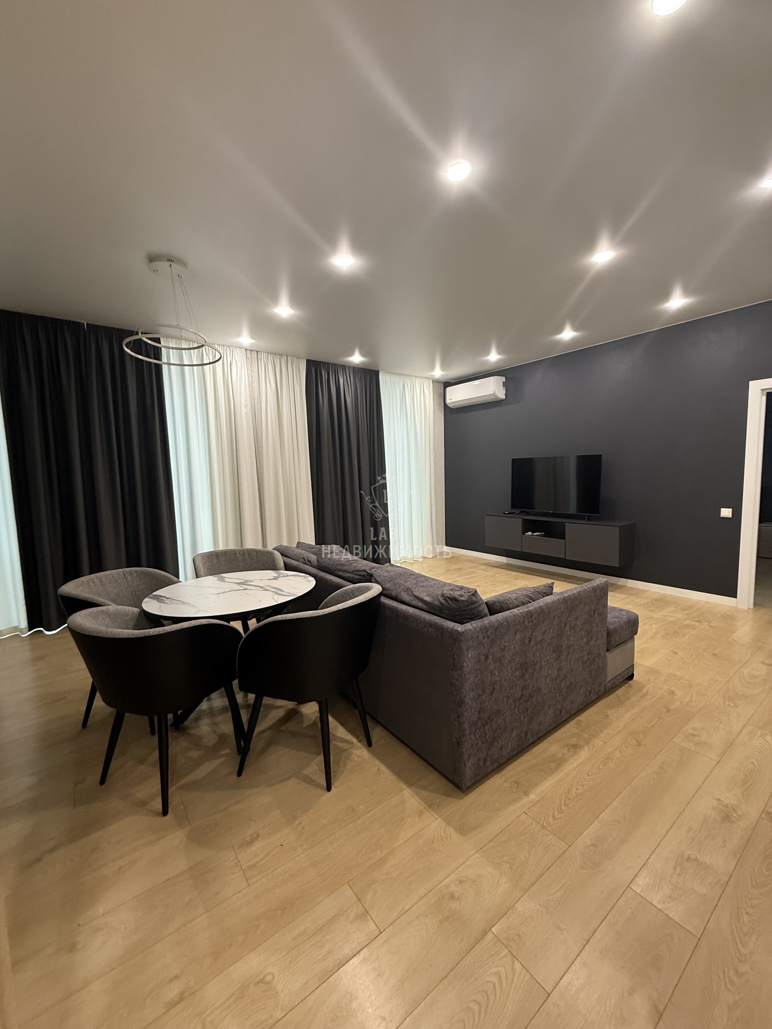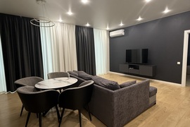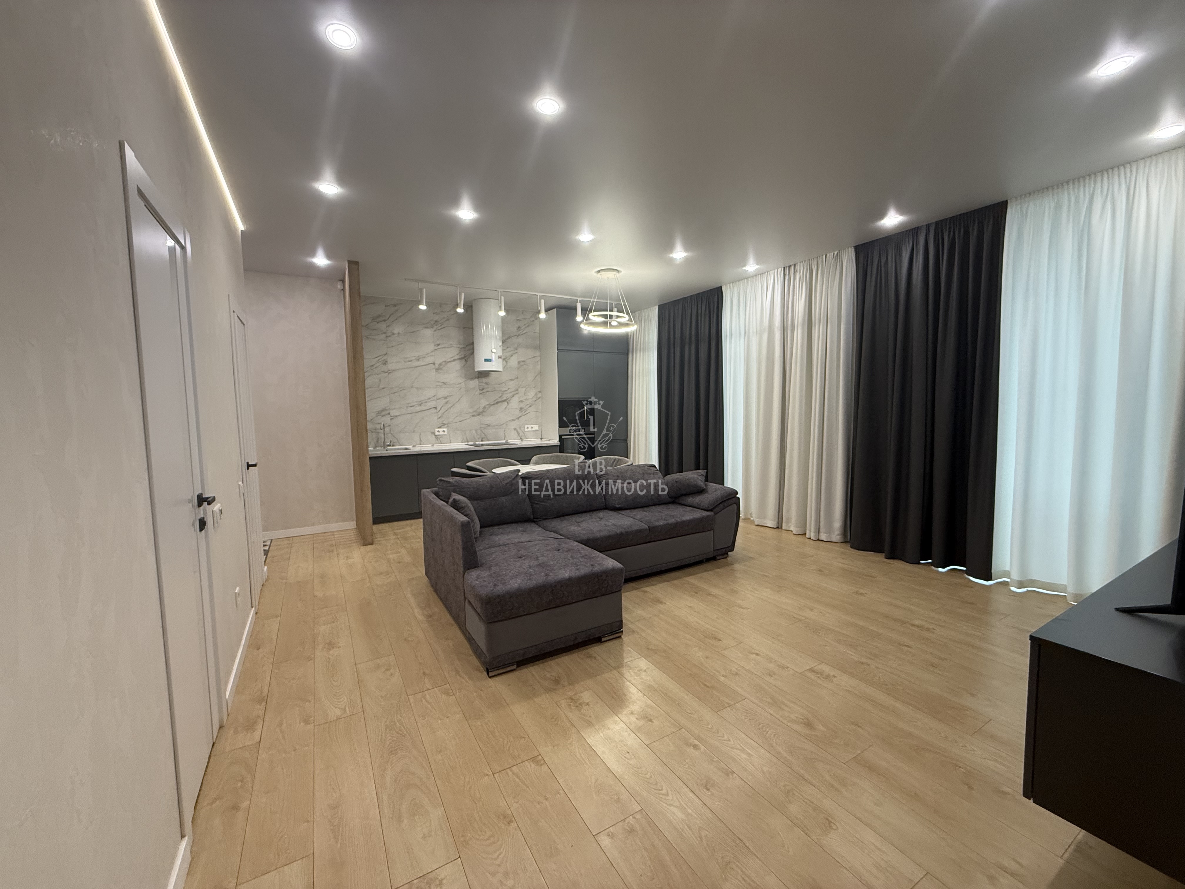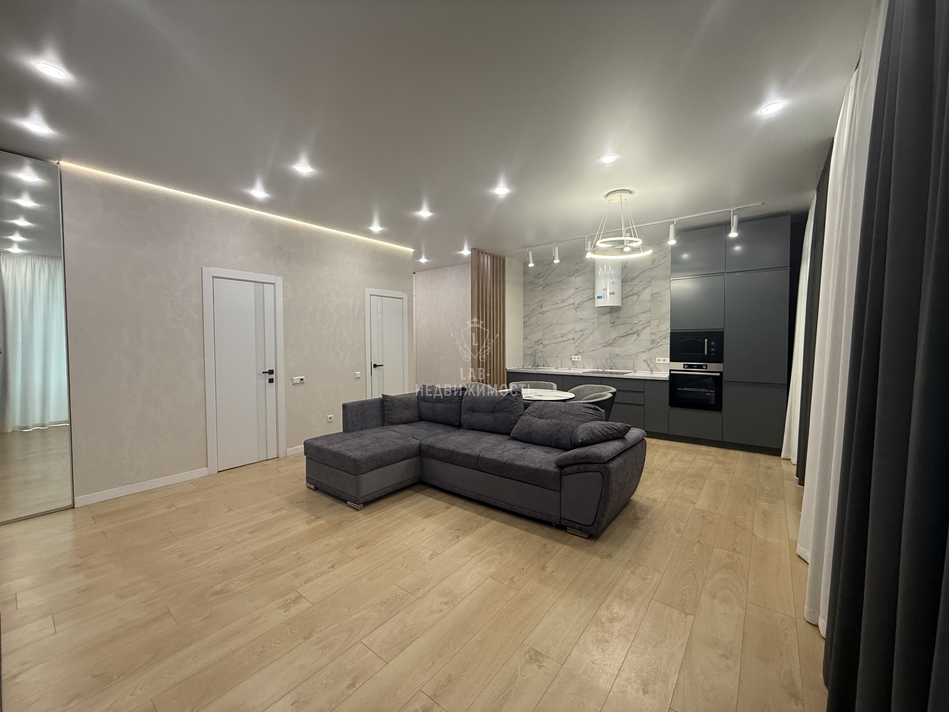 Общая площадь 63,1 кв.м., спальня 18,8 кв.м., кухня- гостиная 25,4 кв.м. В квартире выполнен современный ремонт, есть вся необходимая мебель и техника для проживания ( кухонный гарнитур с встроенной техникой: варочная панель, вытяжка, микроволновая печь, духовой шкаф, встроенный холодильник, посудомоечная машина; стиральная машина, телевизор, wi-fi роутер, диван в кухне-гостинной, двуспальная кровать с подъемным механизмом, прикроватные тумбы, встроенный шкаф купе, шкаф в прихожей, подвесные тумбы под ТВ, а так же есть гардеробная).