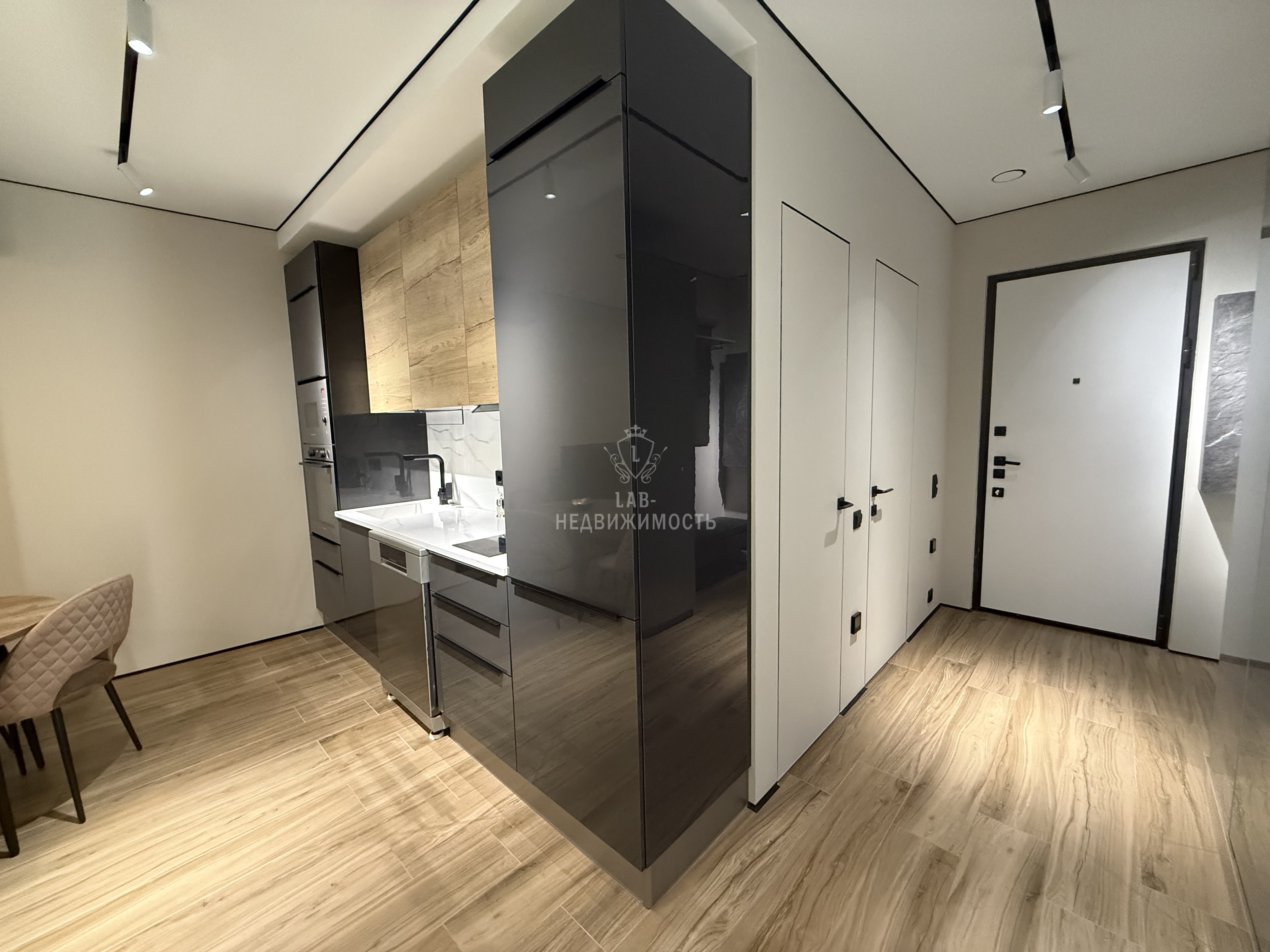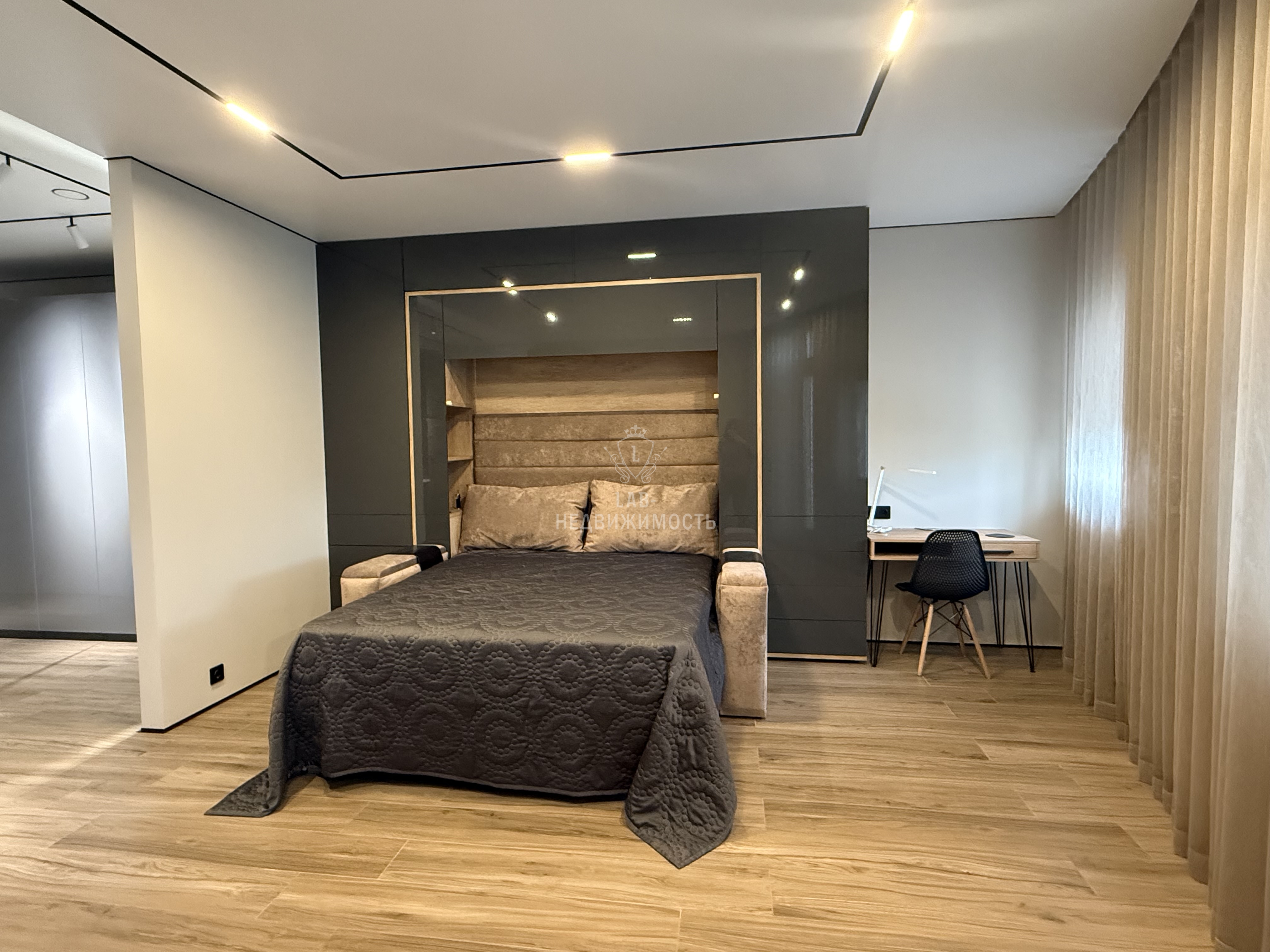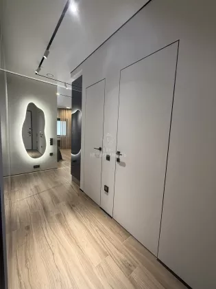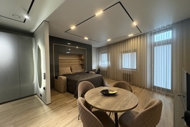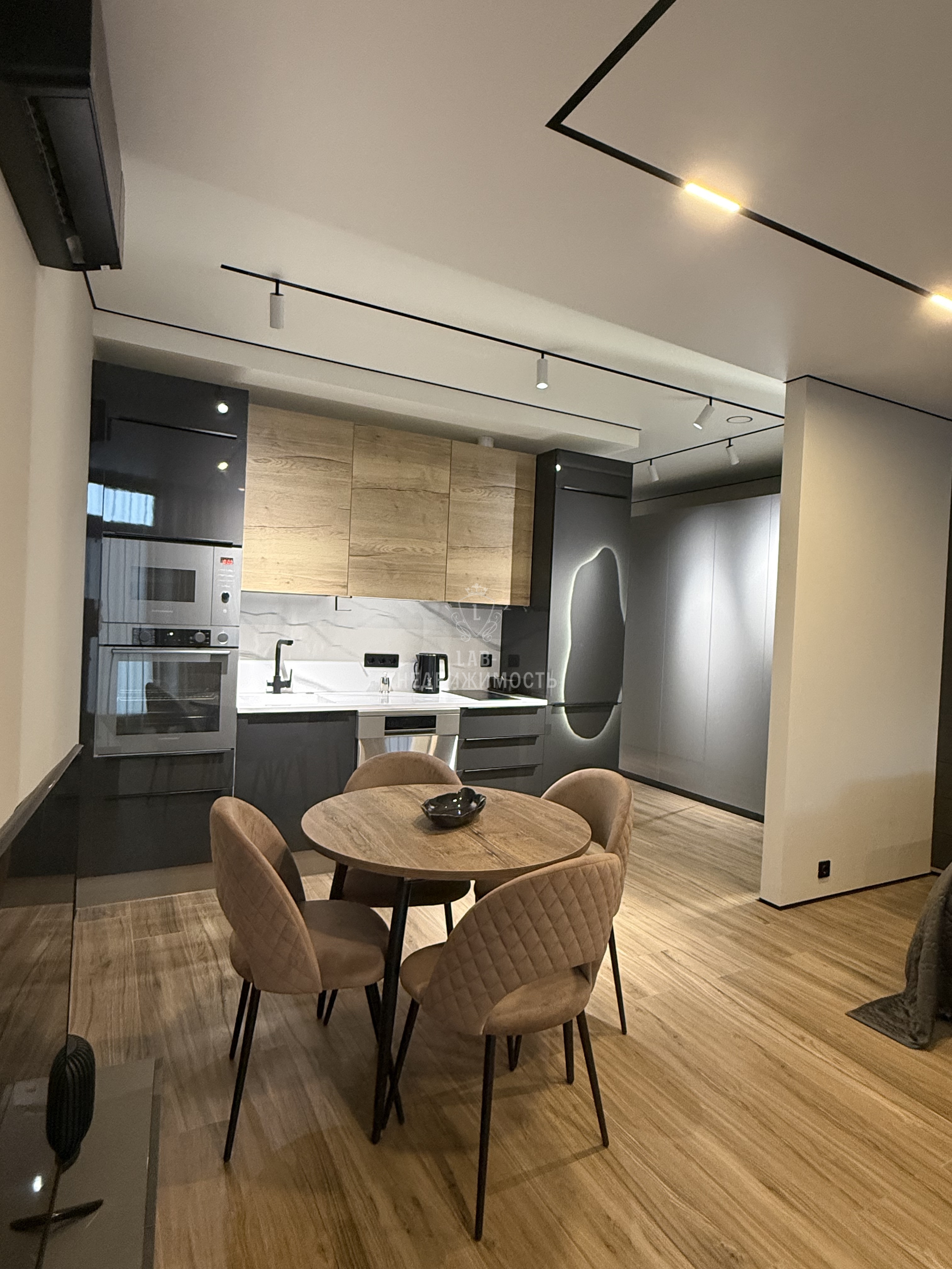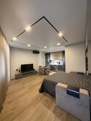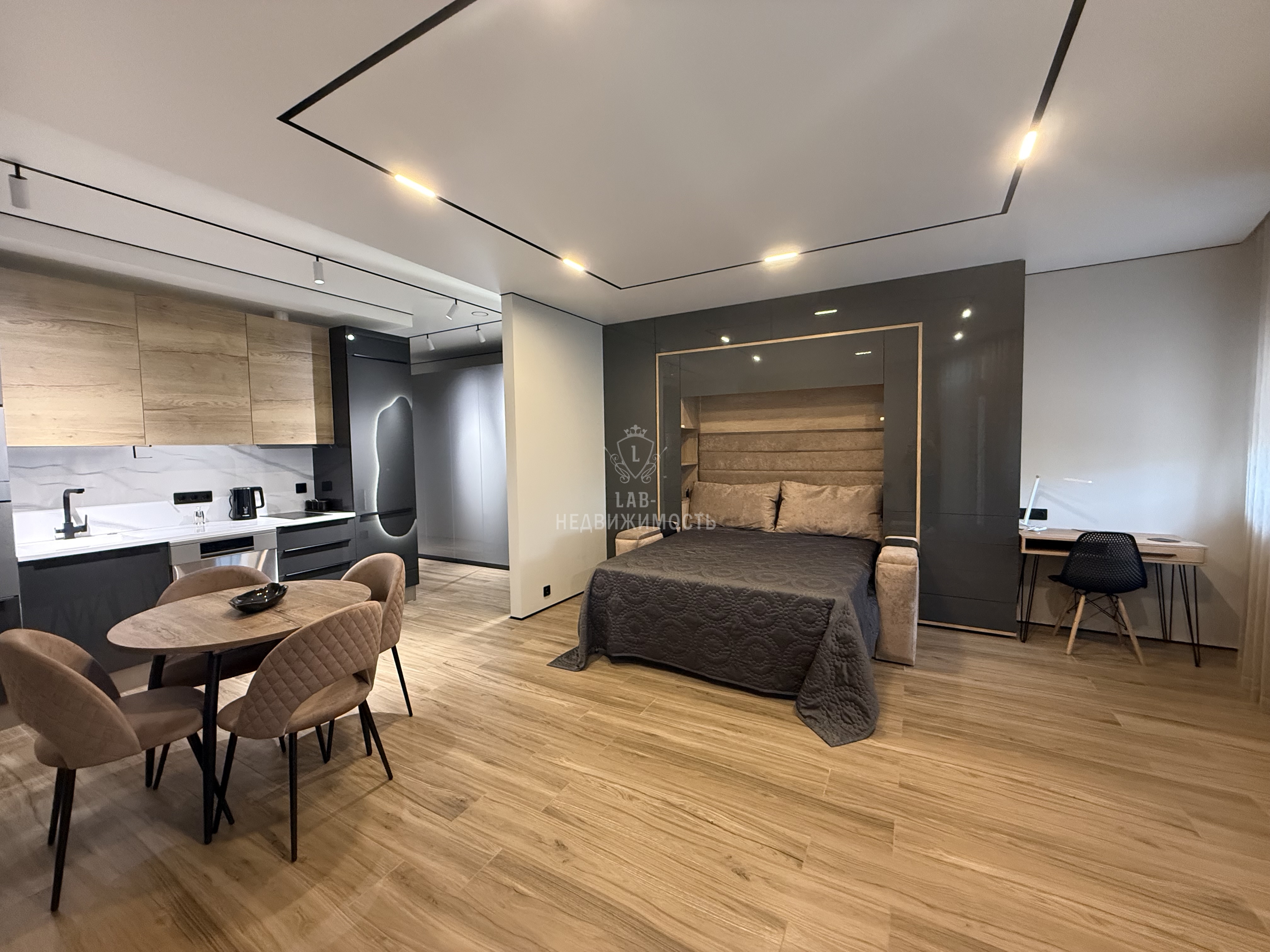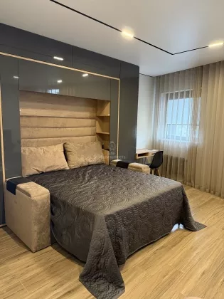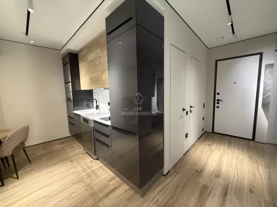 Выполнен дизайнерский ремонт, делали для себя , есть все необходимое для проживания: кухонный гарнитур с встроенной техникой ( микроволновая печь, духовой шкаф, варочная панель, холодильник, посудомоечная машина, вытяжка); обеденная группа; телевизор, кондиционер , кровать двуспальная трансформер, можно ее убрать и получится комфортный диван, продумывалось все до мелочей; есть рабочая зона; места для хранения вещей; место для хранения бытовых принадлежностей, wi-fi.