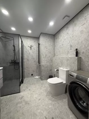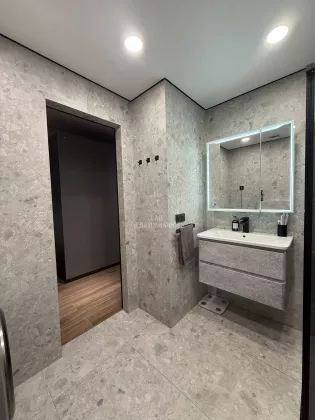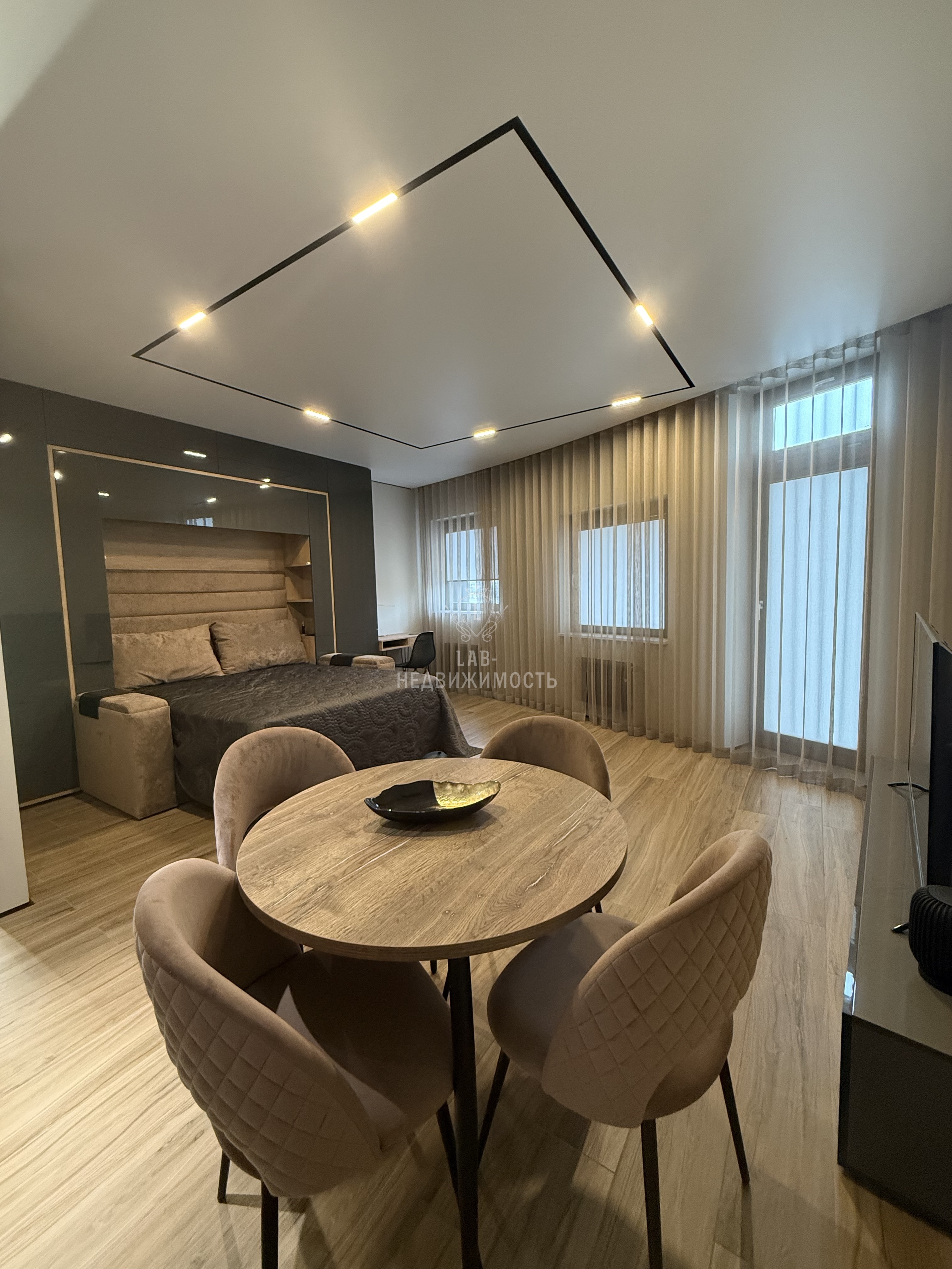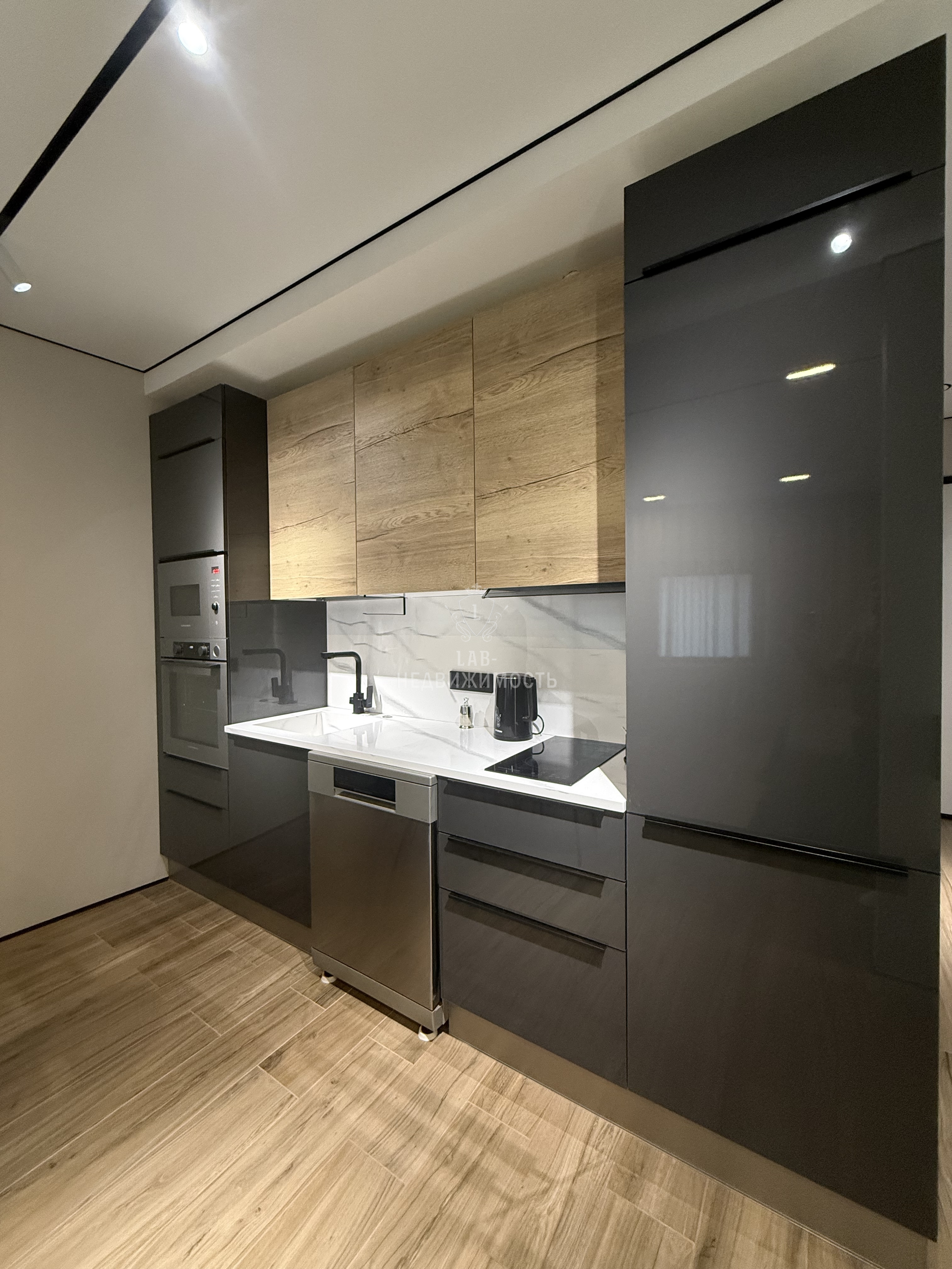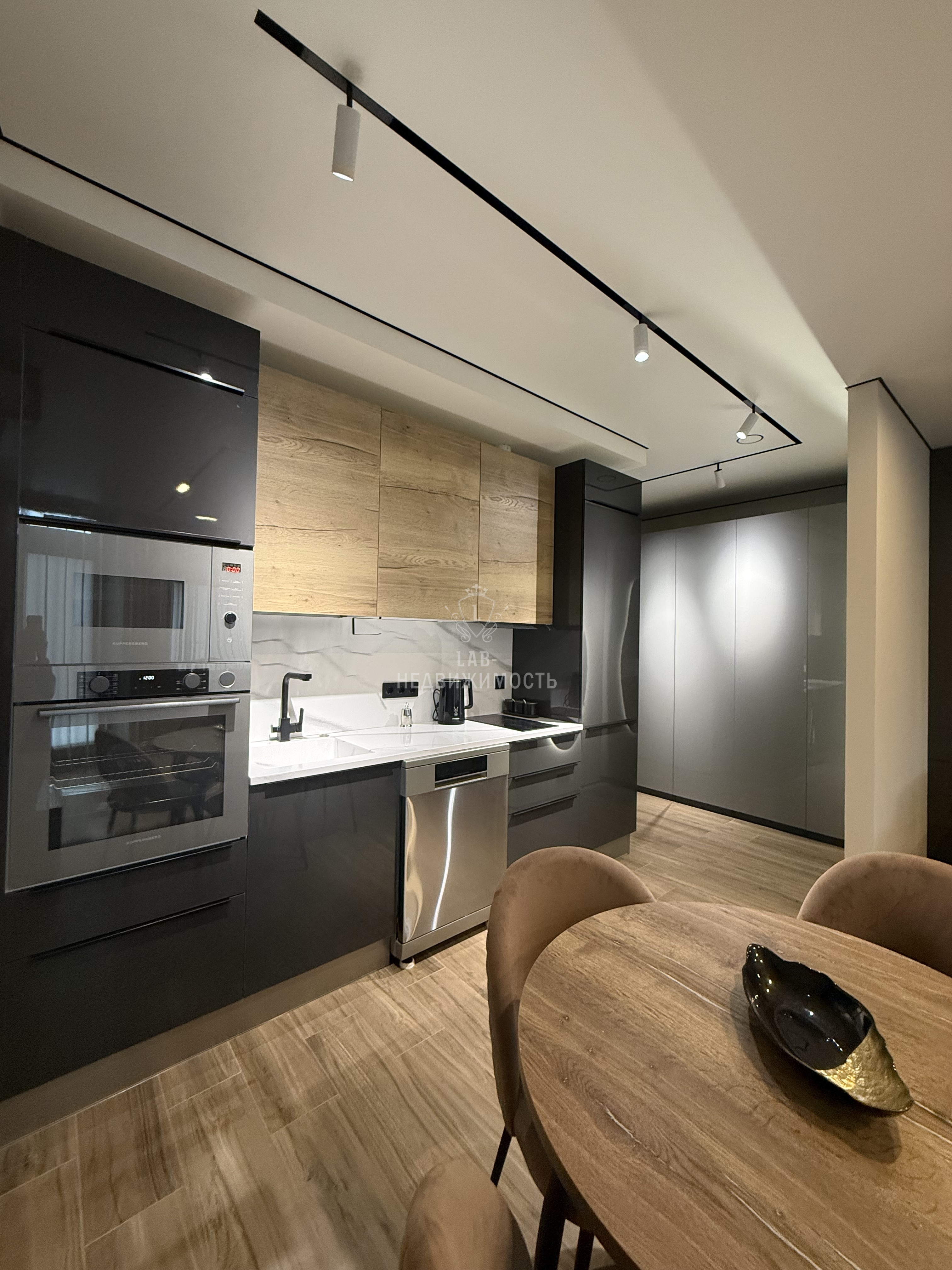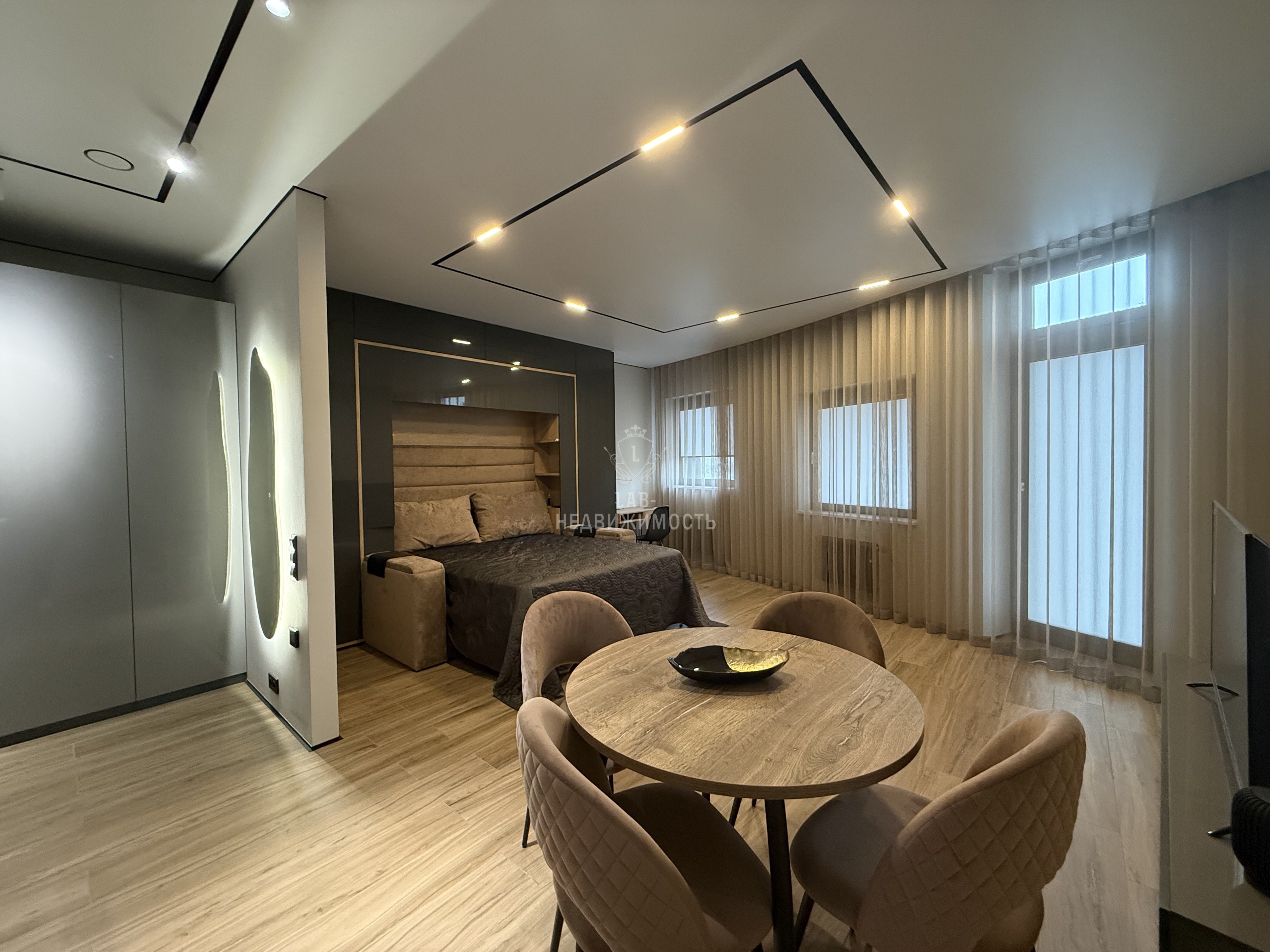 Выполнен дизайнерский ремонт, делали для себя , есть все необходимое для проживания: кухонный гарнитур с встроенной техникой ( микроволновая печь, духовой шкаф, варочная панель, холодильник, посудомоечная машина, вытяжка); обеденная группа; телевизор, кондиционер , кровать двуспальная трансформер, можно ее убрать и получится комфортный диван, продумывалось все до мелочей; есть рабочая зона; места для хранения вещей; место для хранения бытовых принадлежностей, wi-fi.